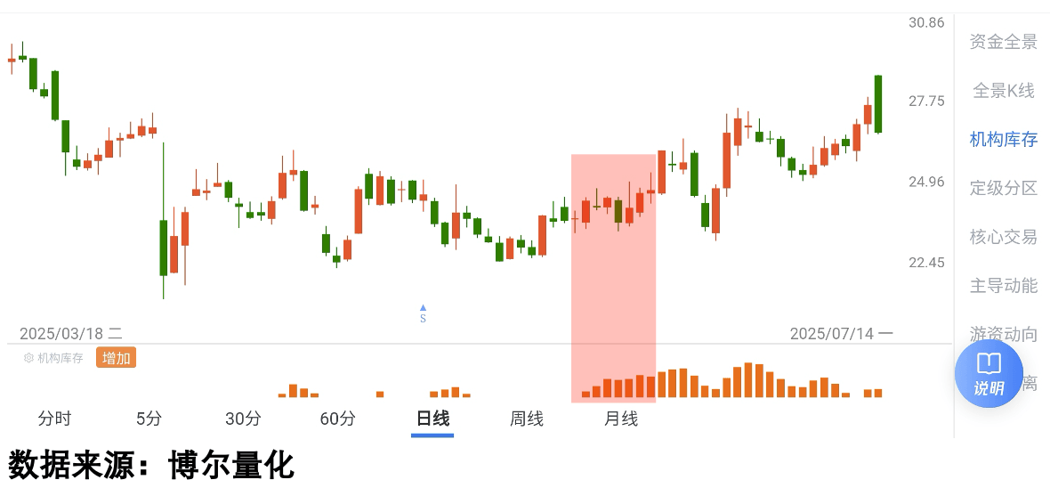 就拿这只表现突出的品种来说,看图1,它的「机构库存」数据从很早开始就持续活跃,不管价格怎么波动,机构资金一直积极参与交易,这种持续的关注度才是支撑它走得远的核心原因。很多人只会盯着价格看,但量化数据能帮你看到背后的资金动作,不被表面的波动迷惑。